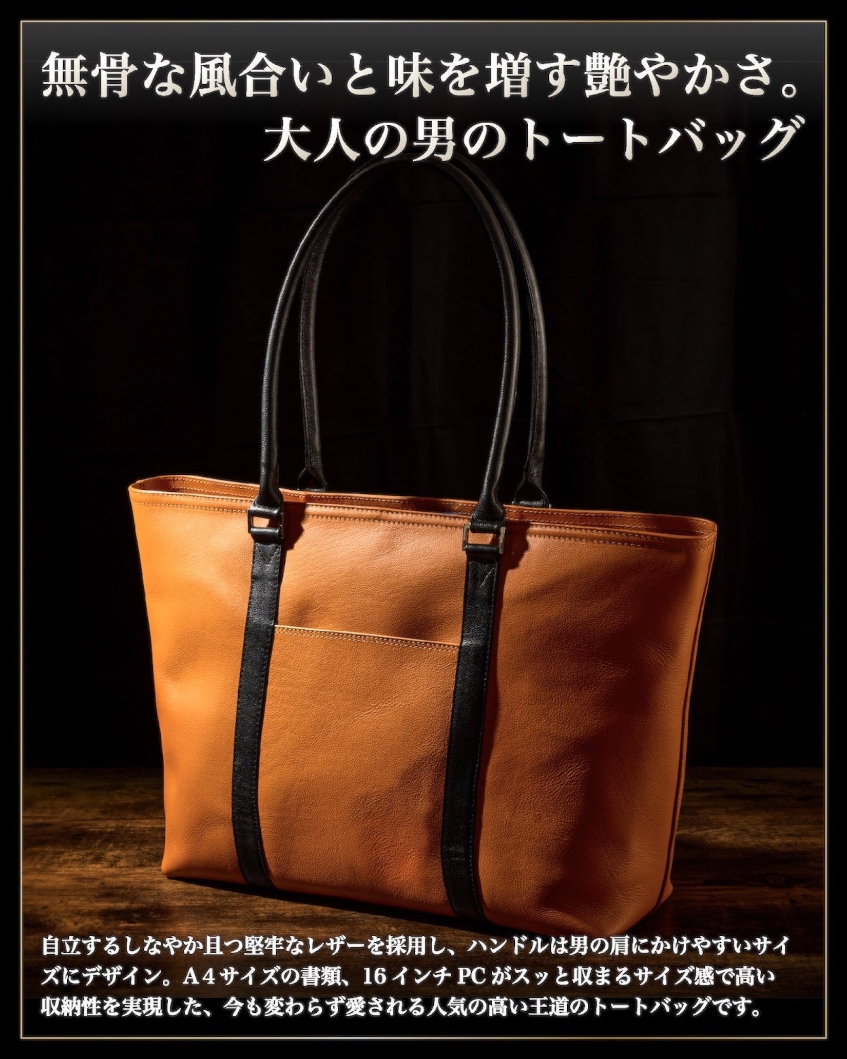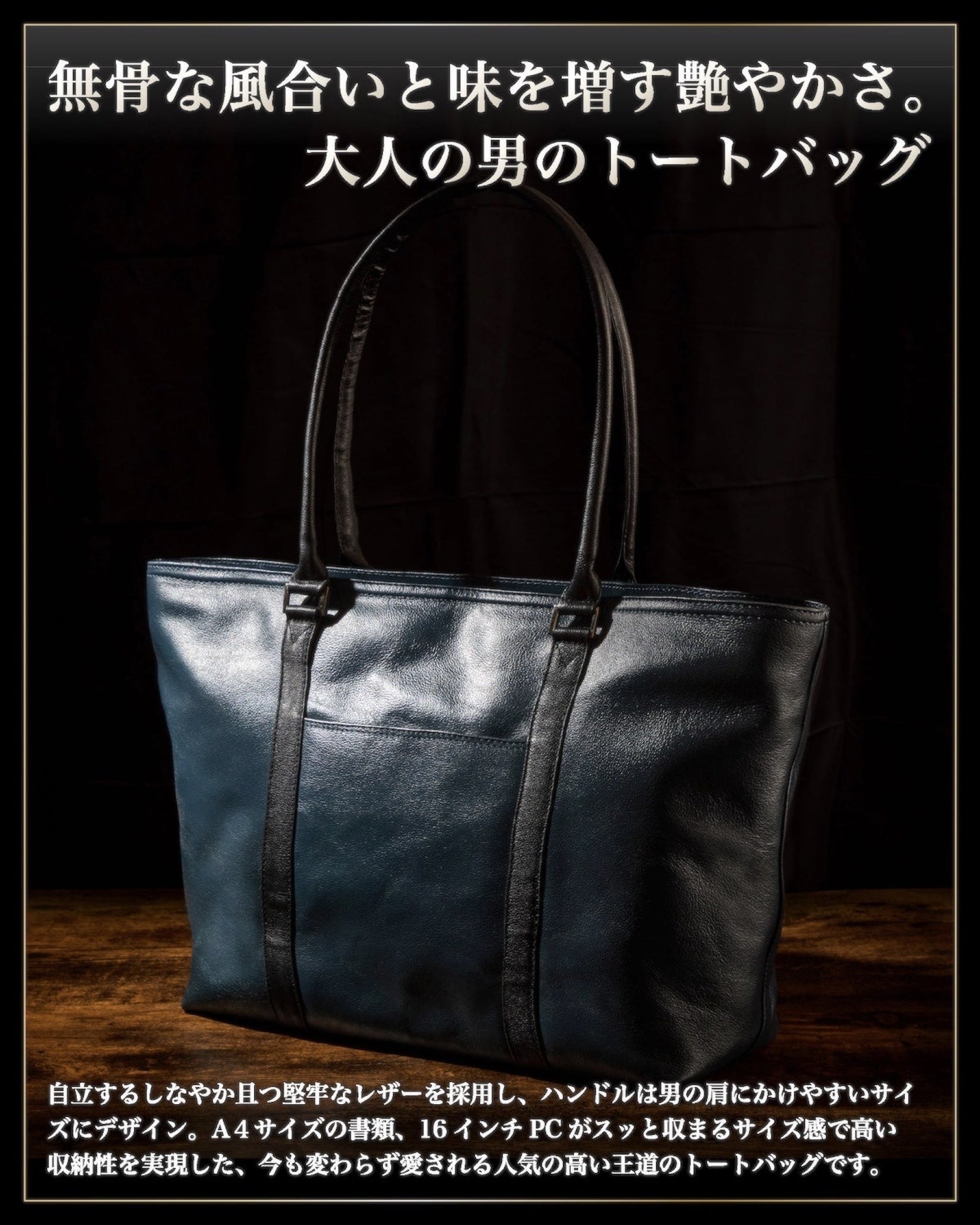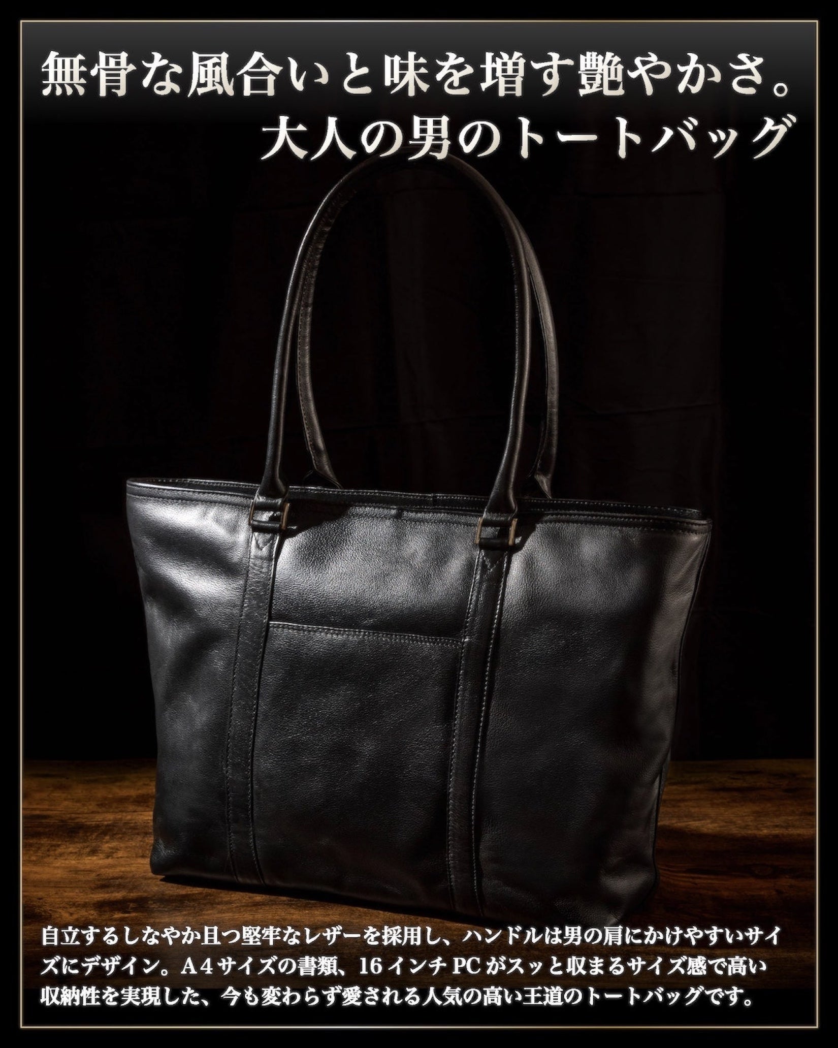 高級感溢れる レザー の風合いと、クラシカルで シンプル なデザインが 男らしくも おしゃれ な印象を引き立てるトートバッグです。