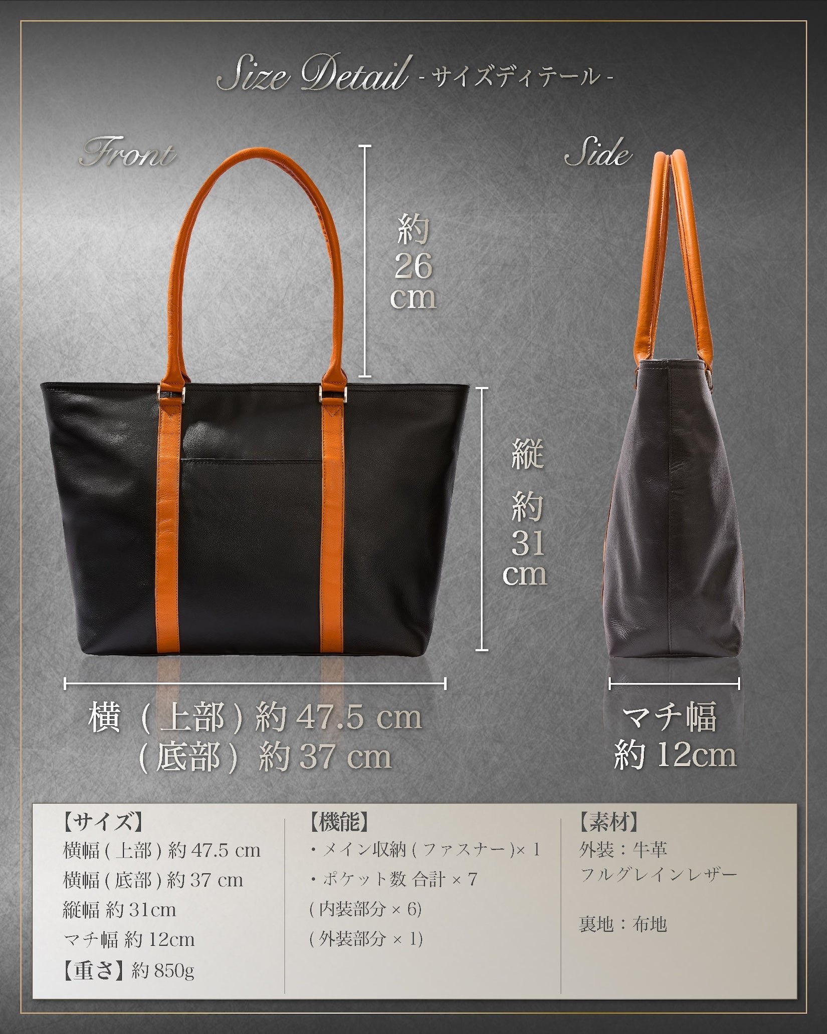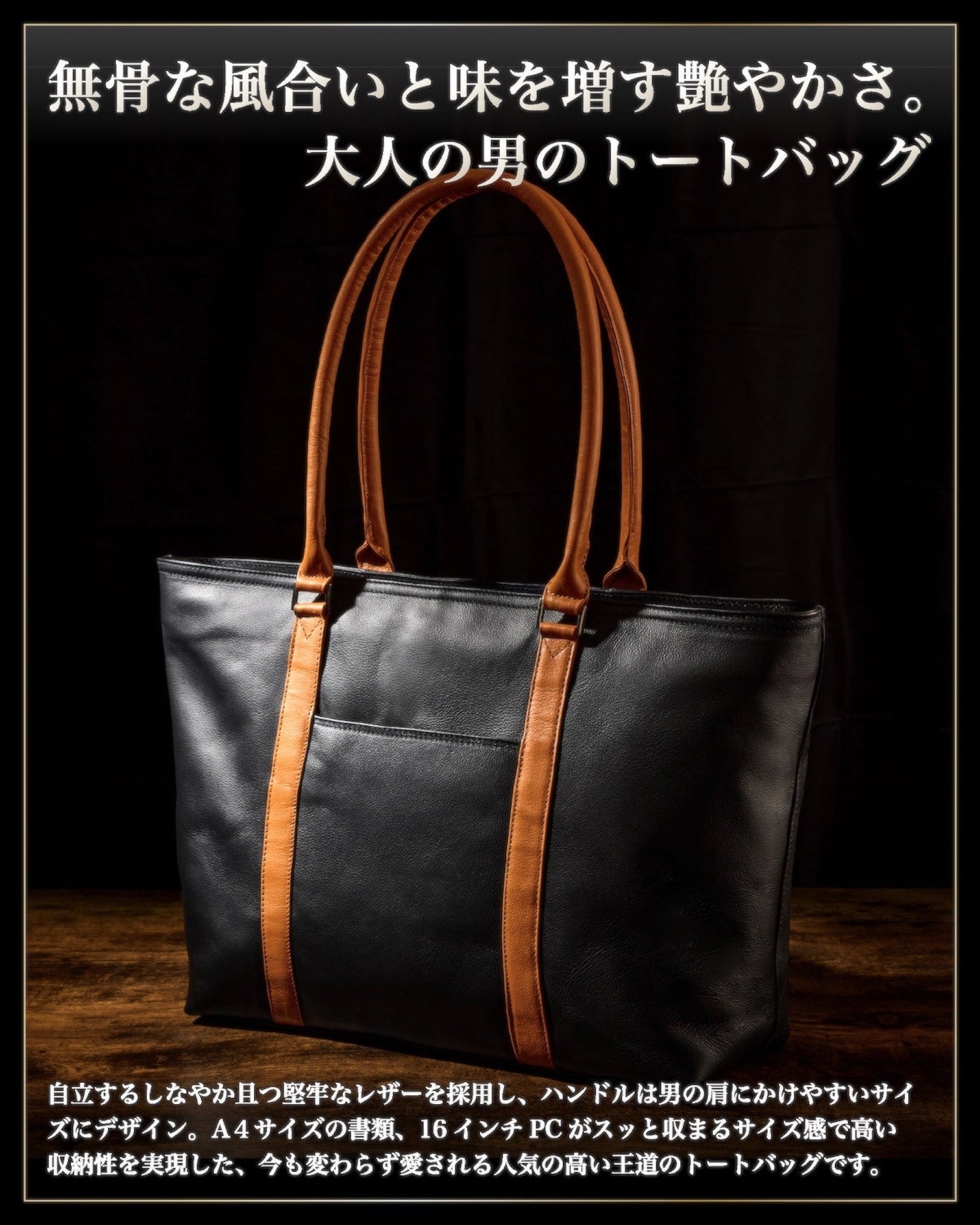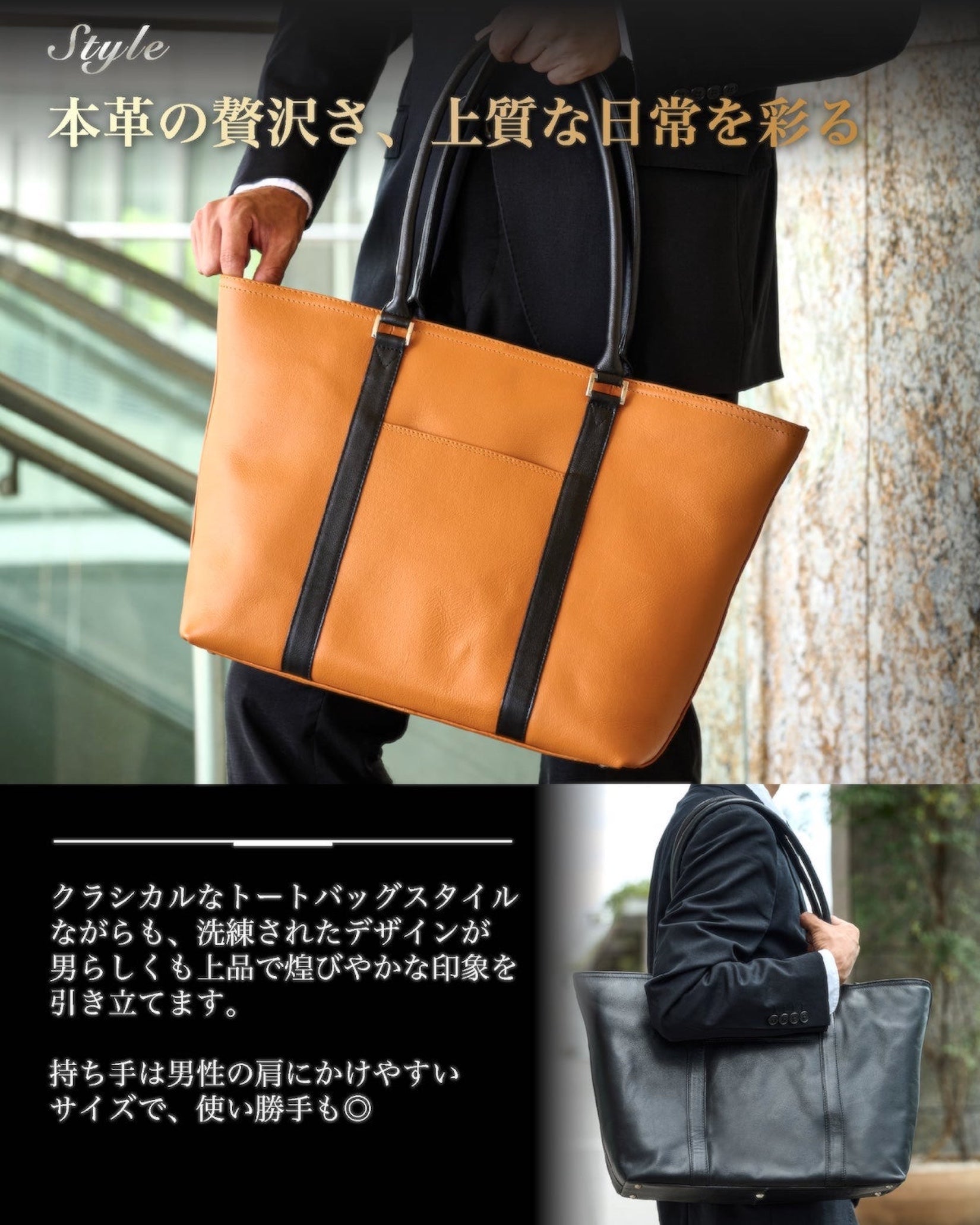 高級感溢れる レザー の風合いと、クラシカルで シンプル なデザインが 男らしくも おしゃれ な印象を引き立てるトートバッグです。