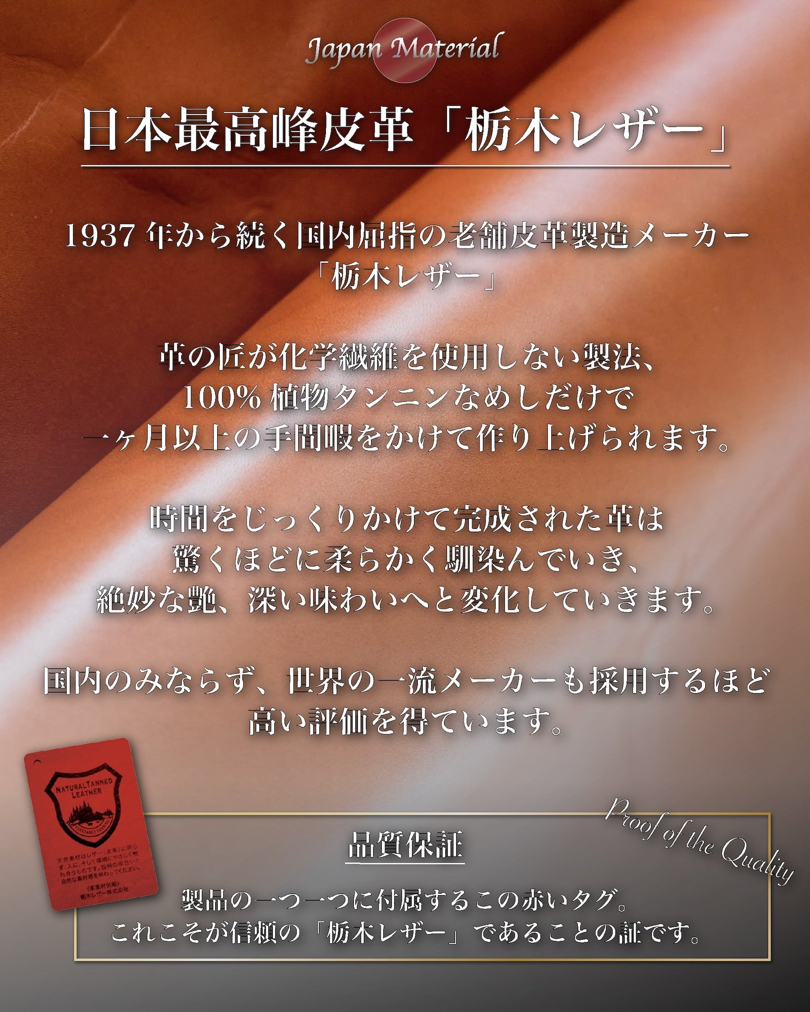 手間と時間をかけ出来上がった「栃木レザー」は、しなやか且つ堅牢であり、使用する月日が経つにつれて、深い味わいに変化していくところが世界的に評価されております。