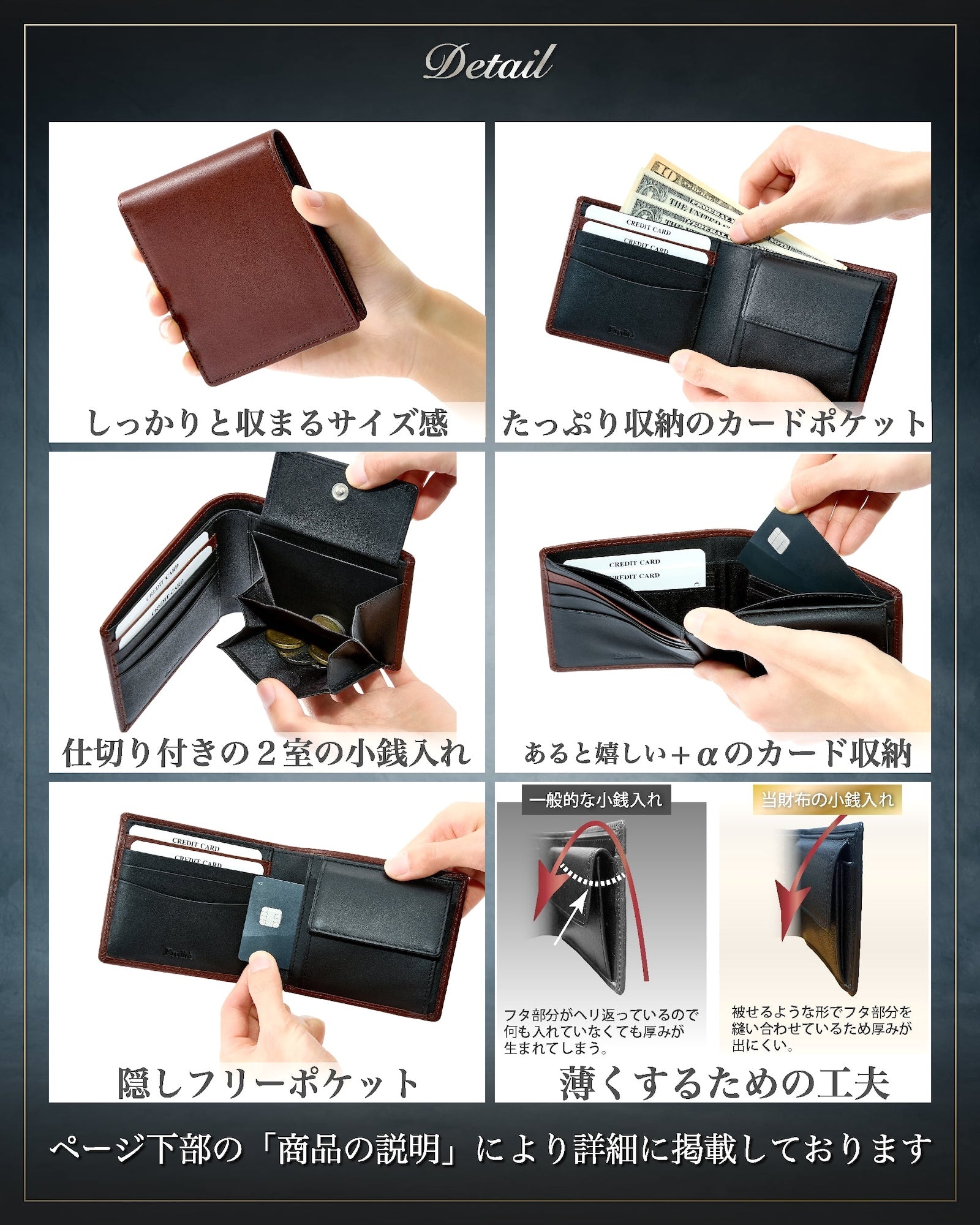 そうすることで見た目の重厚感がグッと増し、外装の革とのコントラストにメリハリが付き、より男らしい雰囲気の財布に仕上がりました。